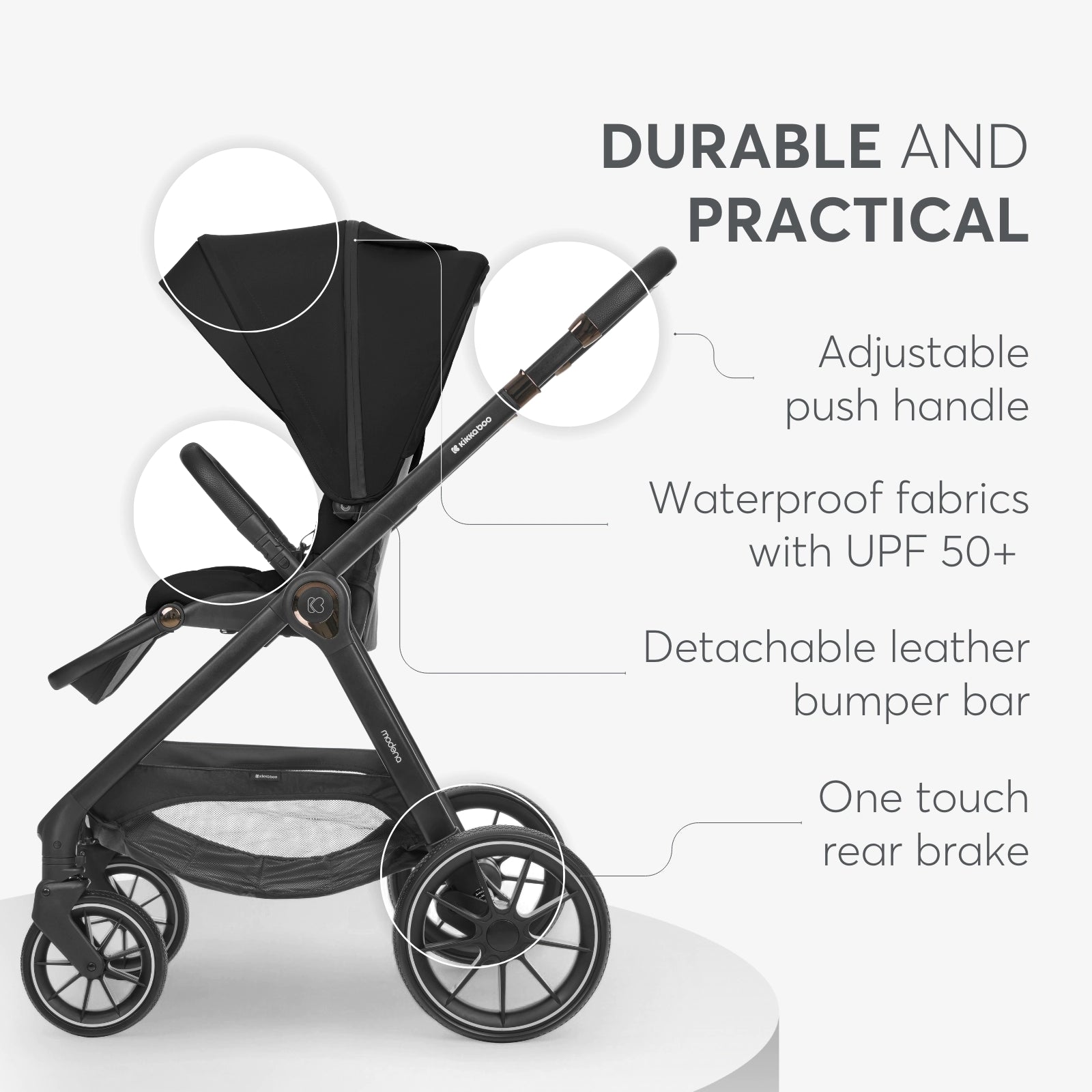 • Customizable Comfort – Features a leather push handle that can be set to your preferred height, a 3-position reclining seat and a 4-position footrest to adjust to your child's comfort.