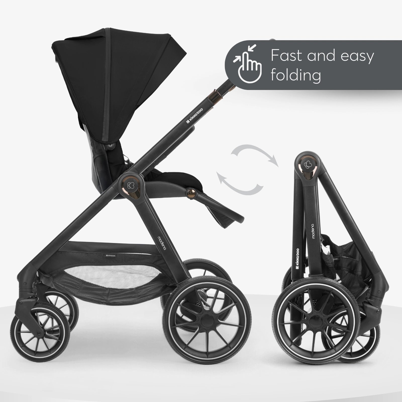 MODENA folds fast and easy with the seat installed and is light enough to carry with ease. It has a large canopy with extension and a window made of UPF50+ waterproof fabric. The stroller set includes additional accessories to make sure you have everything you need while out and about with baby.